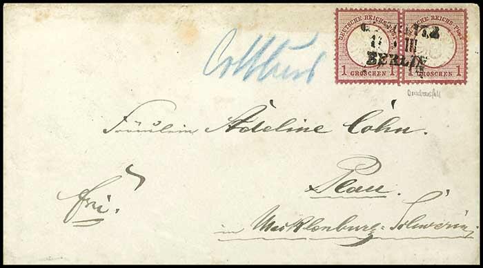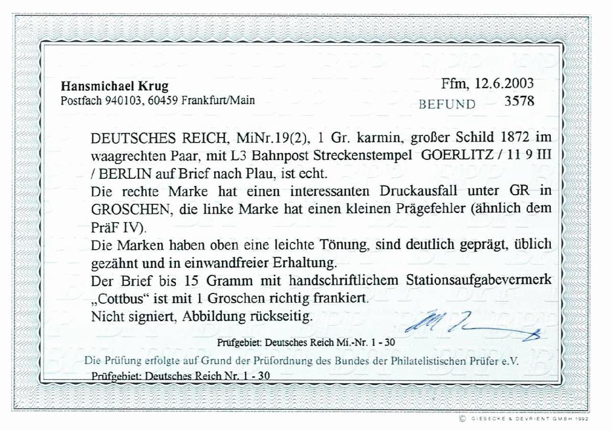 | Zusatzinformationen und Suchstichworte: | Dr. Reinhard Fischer 193. Auktion 21. - 22. Juli 2023 Los 1412 Deutsches Reich, 1872 Grosser Brustschild 1 Gr. karmin, im waagerechten Paar mit Bahnpost-L3 "GOERLITZ / BERLIN" nebst handschriftlichem Stationsaufgabevermerk "Cottbus" auf Briefkuvert. Linke Marke mit kleinem Prägefehler (ähnlich dem PräF IV), rechte Marke mit einem interessanten Druckausfall unter "GR" in "GROSCHEN". Kuvert und Marken oben leichte Tönung. Ausführlicher Fotobefund Krug BPP Ausruf 80,00 EUR |