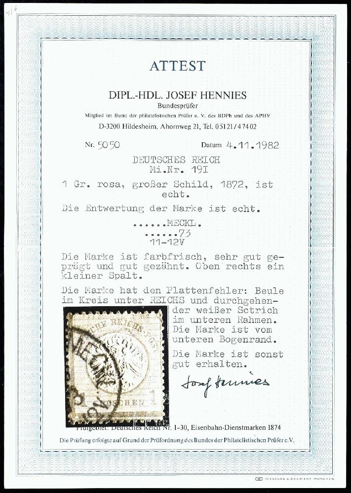 | Zusatzinformationen und Suchstichworte: | Dr. Reinhard Fischer 193. Auktion 21. - 22. Juli 2023 Los 1423 Deutsches Reich, 1872 Grosser Brustschild 1 Gr. rosa mit Plattenfehler "Beule im Kreis unter REICHS sowie heller Strich in unterem Rahmen", gestempelt, oben rechts ein kleiner Spalt, sonst gut erhalten, Fotoattest Hennies BPP, Mi. 400.- Ausruf 60,00 EUR |
