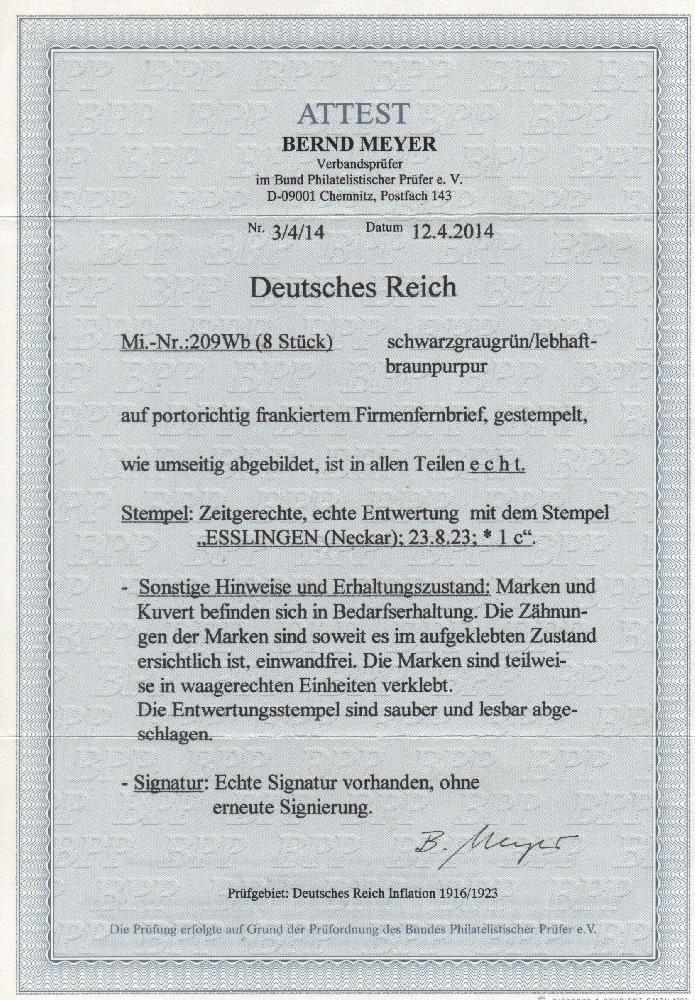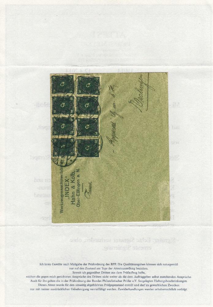 | Zusatzinformationen und Suchstichworte: | Das Attest enthält einen (Schreib-)Fehler: Es handelt sich nicht um einen "Firmenfernbrief", sondern um einen "Firmenortsbrief". Ein Ortsbrief mit dem Datum 23.8.1923 ist portogrecht frankiert (Letzttag PP 15). |