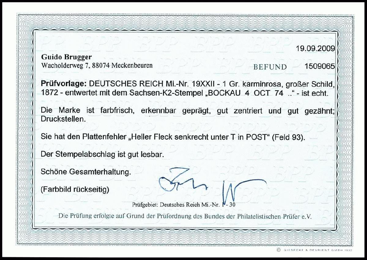 | Zusatzinformationen und Suchstichworte: | Dr. Reinhard Fischer 193. Auktion 21. - 22. Juli 2023 Los 1429 Deutsches Reich, 1872 Grosser Brustschild 1 Groschen großer Schild, karmin, Plattenfehler XXII "heller Fleck senkrecht unter T in Post" (Feld 93), entwertet mit sächsischem K2 "Bockau 4 Oct 74", abgesehen von Druckstellen in schöner Gesamterhaltung, Fotobefund Brugger BPP Ausruf 40,00 EUR |