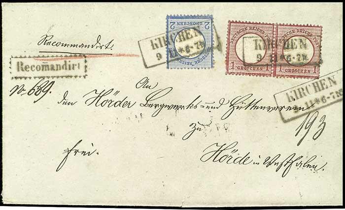 | Zusatzinformationen und Suchstichworte: | Dr. Reinhard Fischer 193. Auktion 21. - 22. Juli 2023 Los 1449 Deutsches Reich, 1872 Grosser Brustschild 1 Groschen großer Schild, karmin, Plattenfehler X in Mischfrankatur mit weiterer 1 Groschen Marke sowie 2 Groschen großer Schild, blau als portogerechte Frankatur auf R-Brief von "Kirchen 9 11" nach Hörder, seltene Darstellung des 4 Groschen Portos, Fotobefund Brugger BPP: "leichte Knitter und etwas Patina" Ausruf 150,00 EUR |