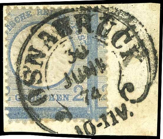 | Zusatzinformationen und Suchstichworte: | Dr. Reinhard Fischer 193. Auktion 21. - 22. Juli 2023 Los 1452 Deutsches Reich 2 Groschen großer Schild, grauultramarin, Besonderheit "vertikal stark um 3,5 mm nach rechts versetzte Zähnung, dadurch linke Wertziffer der rechten Nebenmarke", entwertet mit Hufeisenstempel "Osnabrück 30 Jun 74" (Spalink 30-2) auf Briefstück, Fotobefund Krug BPP: "Die Marke mit Alterstönungen ist deutlich geprägt, üblich gezähnt und in einwandfreier Erhaltung.", solch starke Verzähnungen sind selten, eigentlich hat die Reichsdruckerei solche ausgesondert Ausruf 150,00 EUR |
