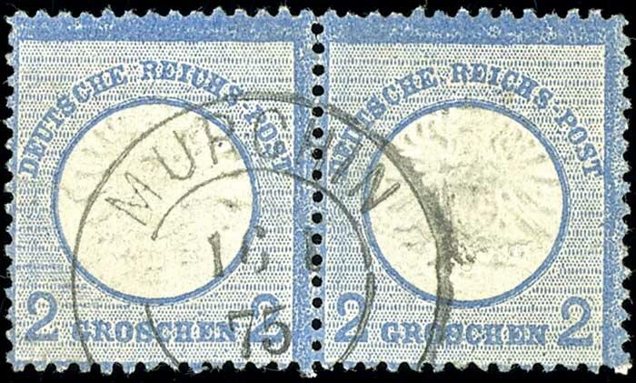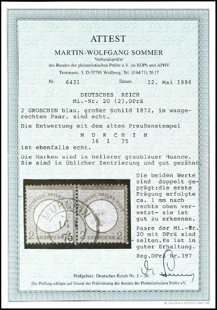 | Zusatzinformationen und Suchstichworte: | Dr. Reinhard Fischer 193. Auktion 21. - 22. Juli 2023 Los 1456 Deutsches Reich, 1872 Grosser Brustschild 2 Groschen großer Schild, blau, Abart "Doppelprägung des Mittelstücks", waagerechtes Paar, zentrisch gestempelt "MURCHIN 16 1 75" (Aufbrauch in der Pfennig Zeit), Einheiten mit Doppelprägung sind große Seltenheiten der Brustschild-Philatelie, Fotoattest Sommer BPP, Mi. 1.400.- (ohne Aufschlag für die seltene Einheit) Ausruf 350,00 EUR |