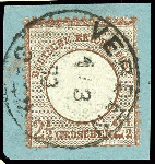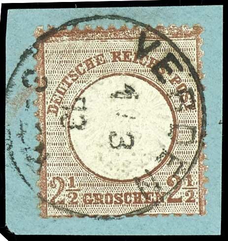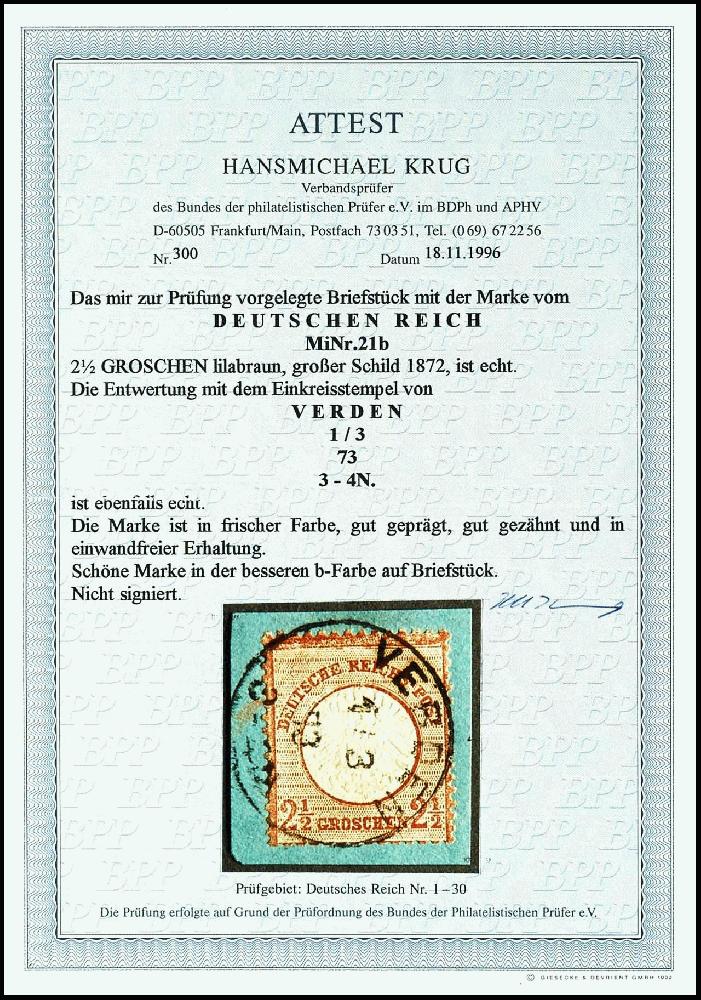 | Zusatzinformationen und Suchstichworte: | Dr. Reinhard Fischer 193. Auktion 21. - 22. Juli 2023 Los 1470 Deutsches Reich, 1872 Grosser Brustschild 2 1/2 Gr. lilabraun mit Ekr. "VERDEN 1/3 73" auf Briefstück, tadellos, Fotoattest Krug BPP, Mi. 700.- Ausruf 200,00 EUR |