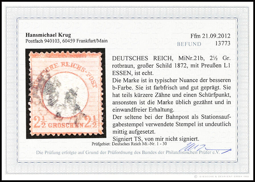| Prüfer: | Krug, Hansmichael (BPP (Bund Philatelistischer Prüfer)) |