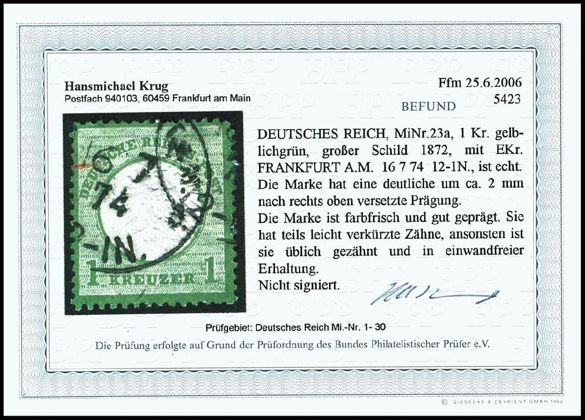 | Zusatzinformationen und Suchstichworte: | Dr. Reinhard Fischer 193. Auktion 21. - 22. Juli 2023 Los 1480 Deutsches Reich, 1872 Grosser Brustschild 1 Kreuzer großer Schild, gelblichgrün, Besonderheit: "deutlich um ca. 2 mm nach rechts oben versetzte Zähnung", entwertet mit Ekr. "Frankfurt a.M. 16 7 74", teils leicht verkürzte Zähne, darüber hinaus in tadelloser Erhaltung, Fotobefund Krug BPP Ausruf 80,00 EUR |