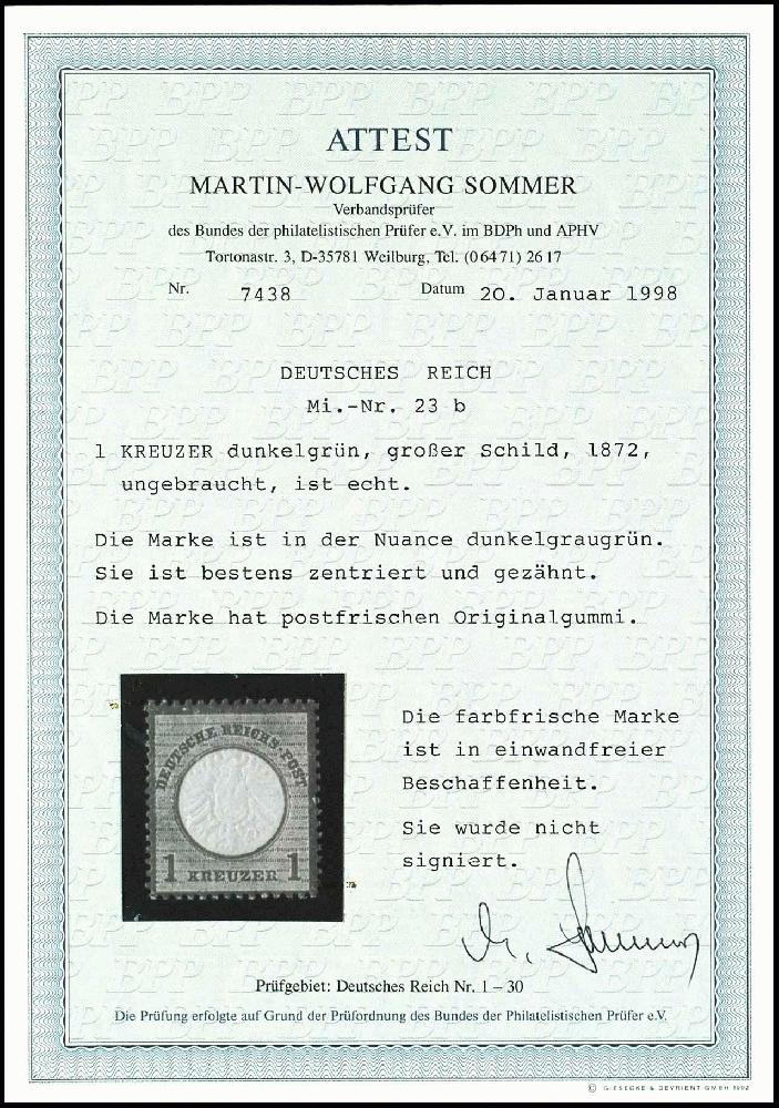 | Zusatzinformationen und Suchstichworte: | Dr. Reinhard Fischer 193. Auktion 21. - 22. Juli 2023 Los 1482 Deutsches Reich, 1872 Grosser Brustschild 1 Kr. dunkelgraugrün, großer Schild, farbfrisch, bestens zentriert und gezähnt, postfrisch, Fotoattest Sommer BPP: "echt und einwandfrei", Mi. 1.500.- Ausruf 450,00 EUR |