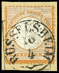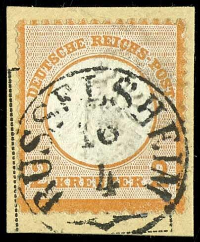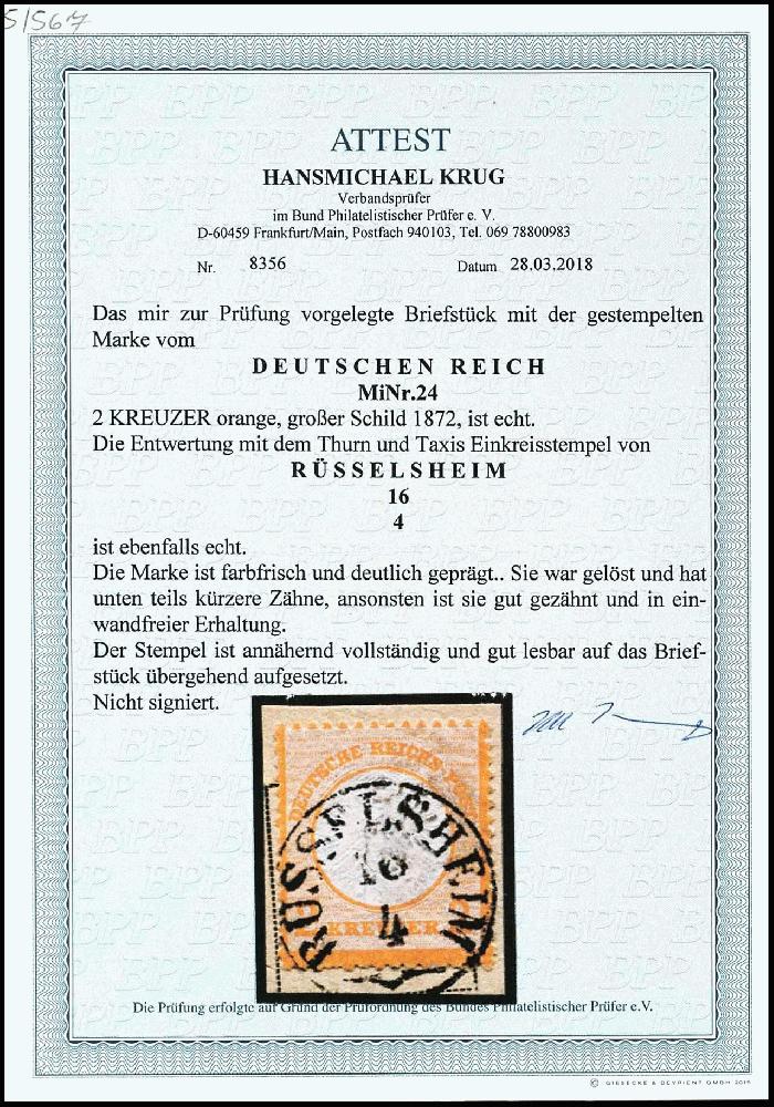 | Zusatzinformationen und Suchstichworte: | Dr. Reinhard Fischer 193. Auktion 21. - 22. Juli 2023 Los 1484 Deutsches Reich, 1872 Grosser Brustschild 2 Kreuzer großer Schild, orange, annähernd vollständig und gut lesbar gestempelt "RÜSSELSHEIM 16 / 4" auf Briefstück, Fotoattest Krug BPP: "Die Marke ist farbfrisch und deutlich geprägt, sie war gelöst und hat unten teils kurze Zähne, ansonsten ist sie gut gezähnt und in einwandfreier Erhaltung" Ausruf 600,00 EUR |