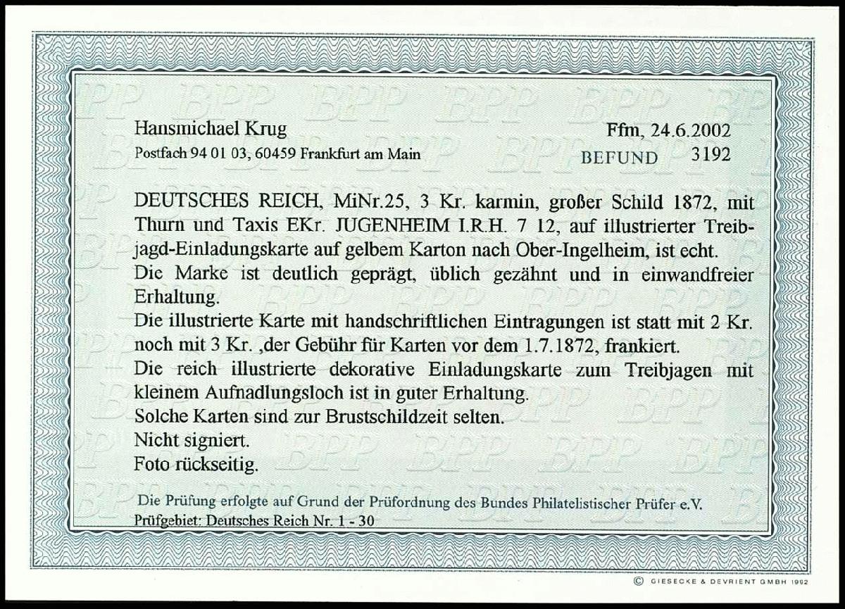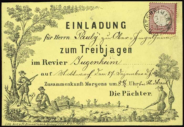 | Zusatzinformationen und Suchstichworte: | Dr. Reinhard Fischer 193. Auktion 21. - 22. Juli 2023 Los 1487 Deutsches Reich, 1872 Grosser Brustschild 3 Kreuzer Großer Brustschild, karmin auf sehr dekorativer Einladungskarte zum Treibjagen. Laut Fotobefund Krug (2002): "Die illustrierte Karte mit handschriftlichen Eintragungen ist statt mit 2 Kr. noch mit 3 Kr., der Gebühr für Karten vor dem 1.7.1872 frankiert. Die reich illustrierte, dekorative Einladungskarte zum Treibjagen, mit kleinem Aufnadelungsloch, ist in guter Erhaltung. Solche Karten sind zur Brustschild-Zeit selten." Ausruf 1.000,00 EUR |