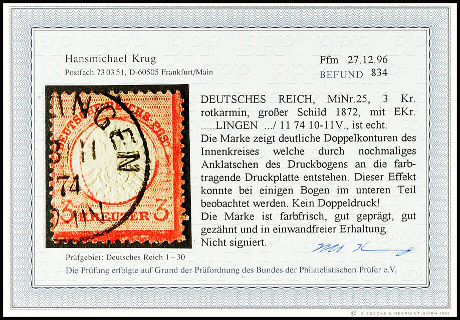 | Zusatzinformationen und Suchstichworte: | Dr. Reinhard Fischer 193. Auktion 21. - 22. Juli 2023 Los 1491 Deutsches Reich, 1872 Grosser Brustschild 3 Kr. rotkarmin mit deutlichen Doppelkonturen des Innenkreises, gestempelt, Kabinett, Fotobefund Krug BPP, Mi. 700.- für die volle Ausprägung Ausruf 80,00 EUR |