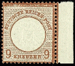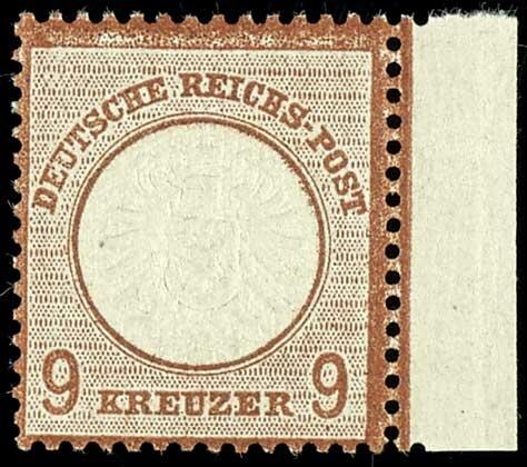 | Zusatzinformationen und Suchstichworte: | Dr. Reinhard Fischer 193. Auktion 21. - 22. Juli 2023 Los 1513 Deutsches Reich, 1872 Grosser Brustschild 9 Kr. rötlichbraun, großer Schild, farbfrisch, sehr gut geprägt und gezähnt, rechtes Randstück postfrisch, Fotoattest Krug BPP: "echt, in einwandfreier vorzüglicher Erhaltung", Mi. 2.500.- - letzter Zuschlag für ein qualitativ gleichwertiges Stück jedoch ohne Bogenrand in unserer 186. Auktion 1.800.- Euro zzgl. Aufgeld! Ausruf 1000,00 EUR |