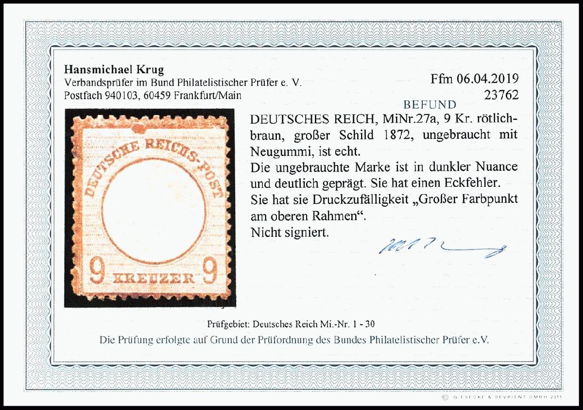 | Zusatzinformationen und Suchstichworte: | Dr. Reinhard Fischer 193. Auktion 21. - 22. Juli 2023 Los 1514 Deutsches Reich, 1872 Grosser Brustschild 9 Kreuzer Großer Schild rötlichbraun, Druckzufälligkeit "Großer Farbpunkt am oberen Rahmen", ungebraucht mit Neugummierung, Eckfehler, Fotobefund Hansmichael Krug BPP, Mi. 200.- für (*) schon für die Normalmarke! Ausruf 50,00 EUR |