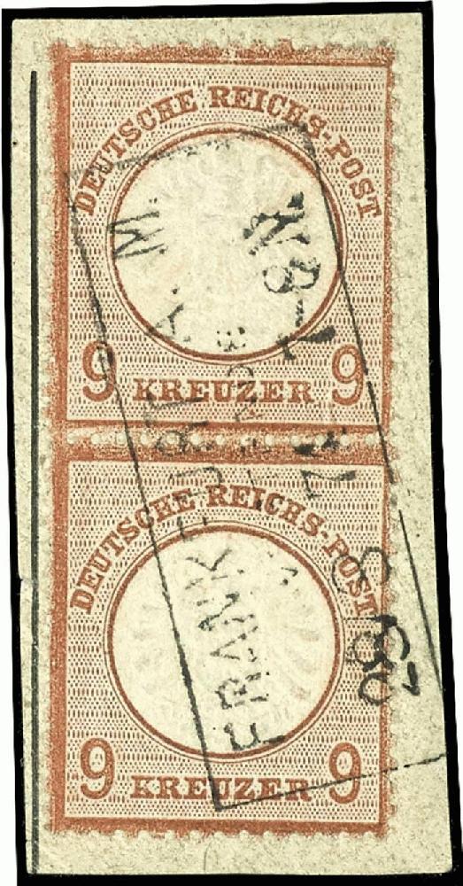 | Zusatzinformationen und Suchstichworte: | Dr. Reinhard Fischer 193. Auktion 21. - 22. Juli 2023 Los 1517 Deutsches Reich, 1872 Grosser Brustschild 9 Kreuzer rötlichbraun, großes Schild, farbfrisches, senkrechtes Paar, entwertet mit Ra3 "Frankfurt A. M. Westende 28 8 74 7-8N" auf Briefstück, tadellose Erhaltung, senkrechte Paare sind seltener als waagerechte, Fotoattest Krug BPP (2020): "in einwandfreier Erhaltung.", Mi. 1.300.- Ausruf 450,00 EUR |