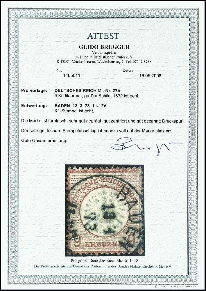| Zusatzinformationen und Suchstichworte: | Dr. Reinhard Fischer 193. Auktion 21. - 22. Juli 2023 Los 1521 Deutsches Reich, 1872 Grosser Brustschild 9 Kreuzer großer Schild, lilabraun, entwertet mit K1 "Baden 13 3 73", abgesehen von einer Druckspur befindet sich die Marke in insgesamt tadelloser Gesamterhaltung, Fotoattest Brugger BPP, Mi. 650.- Ausruf 100,00 EUR |