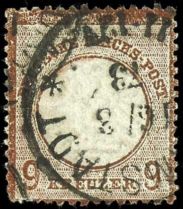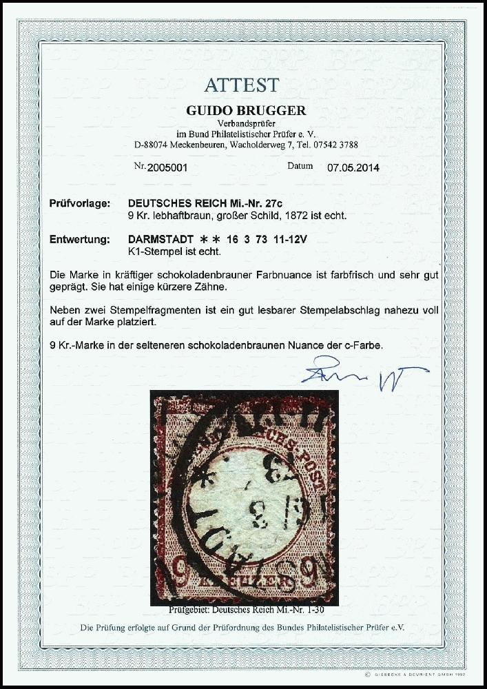 | Zusatzinformationen und Suchstichworte: | Dr. Reinhard Fischer 193. Auktion 21. - 22. Juli 2023 Los 1523 Deutsches Reich, 1872 Grosser Brustschild 9 Kreuzer großer Schild, schokoladenbraun, entwertet mit K1 "Darmstadt 16 3 73 11-12V", abgesehen von einigen kürzeren Zähnen in tadelloser Erhaltung, Fotoattest Brugger BPP: "9 Kr.-Marke in der selteneren schokoladenbraunen Nuance der c-Farbe.", Mi. 1.700.- Ausruf 200,00 EUR |