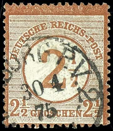 | Zusatzinformationen und Suchstichworte: | Dr. Reinhard Fischer 193. Auktion 21. - 22. Juli 2023 Los 1525 Deutsches Reich 2 1/2 auf 2 1/2 Groschen großer Schild, braunorange, Besonderheit "um 2 mm nach rechts versetzte Prägung", entwertet mit Ekr. "Hamburg P. V. 2 30 4 75", Aufbrauch als 25 Pfennige Marke im Jahr 1875, bis auf eine kleine helle Stelle in tadelloser Erhaltung, Fotobefund Krug BPP Ausruf 40,00 EUR |
