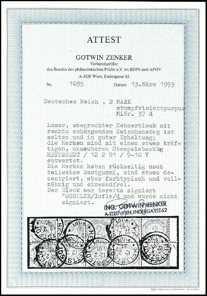 | Zusatzinformationen und Suchstichworte: | Dr. Reinhard Fischer 193. Auktion 21. - 22. Juli 2023 Los 1539 Deutsches Reich, 1875/92 2 Mark 2 Mark stumpfviolettpurpur, waagerechter Zehnerblock ( 5 x 2) mit rechts anhängenden Zwischenstegen, jeder Wert gestempelt "HETTSTEDT 12 2 91 9-10V", saubere Bedarfserhaltung, Fotoattest Zenker BPP, seltene Einheit! Ausruf 200,00 EUR |