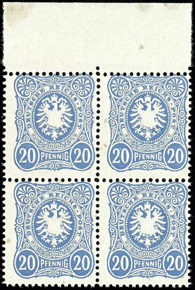 | Zusatzinformationen und Suchstichworte: | Dr. Reinhard Fischer 193. Auktion 21. - 22. Juli 2023 Los 1546 Deutsches Reich, 1880/89 Pfennig 20 Pfennig kobaltblau, Oberrand-4er-Block (Feld 5/6, 15/16) postfrisch, Fotoattestkopie Petry BPP für ehemaligen Bogen: "echt und einwandfrei", Mi. 680,- Ausruf 150,00 EUR |
