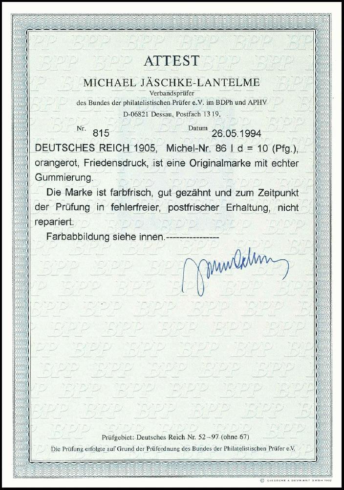| Prüfer: | Jäschke-Lantelme, Michael (BPP (Bund Philatelistischer Prüfer)) |