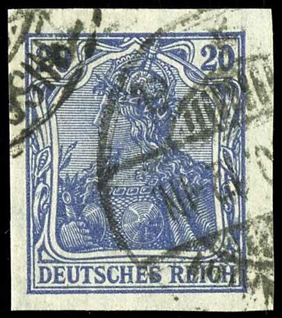| Zusatzinformationen und Suchstichworte: | Dr. Reinhard Fischer 193. Auktion 21. - 22. Juli 2023 Los 1626 Deutsches Reich, Germania mit WZ 20 Pfennig Germania, dunkelviolettblau Kriegsdruck, Abart "ungezähnt", ringsum sehr breitrandig, mit sauberen Teilstempeln "ZWISCHENAHN" in farbfrischer und fehlerfreier Erhaltung, Fotoattest Jäschke Lantelme BPP: "in fehlerfreier, gebrauchter Erhaltung." Ausruf 1.200,00 EUR |