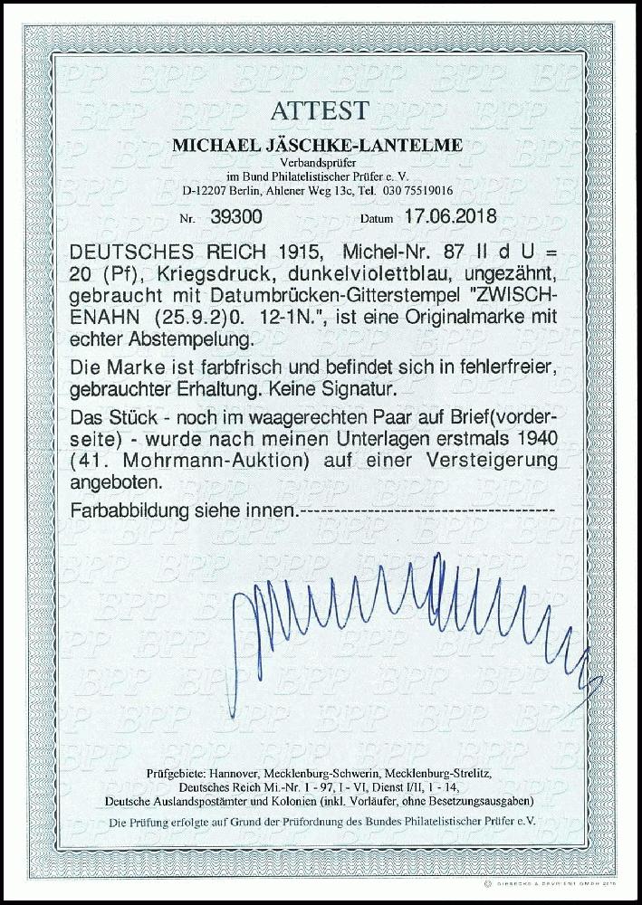 | Prüfer: | Jäschke-Lantelme, Michael (BPP (Bund Philatelistischer Prüfer)) |