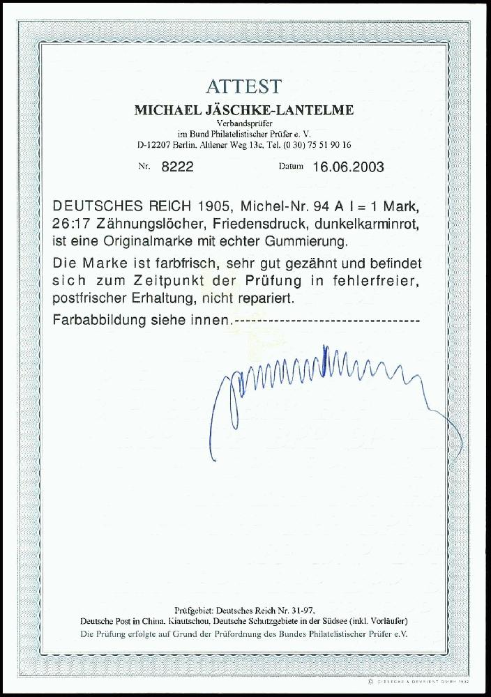 | Prüfgebiet: | Deutsches Reich 1871 - 1918 (Mi-Nr. 1 - 106) |