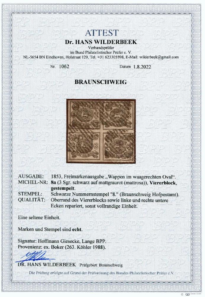 | Zusatzinformationen und Suchstichworte: | 32. Schlegel Auktionshaus Auktion 15. - 19. Mai 2023 Los 5162 Altdeutschland Braunschweig 1853, 3 Sgr. schwarz auf mattgraurot, Viererblock mit Nummernstempelentwertung "8." von Braunschweig. Die seltene Einheit ist vollrandig aber repariert und optisch eindrucksvoll. Signiert u.a. Lange BPP und Dr. Wilderbeek BPP. Aus der ehemaligen Boker Sammlung 1988 Zuschlag 450,00 EUR |