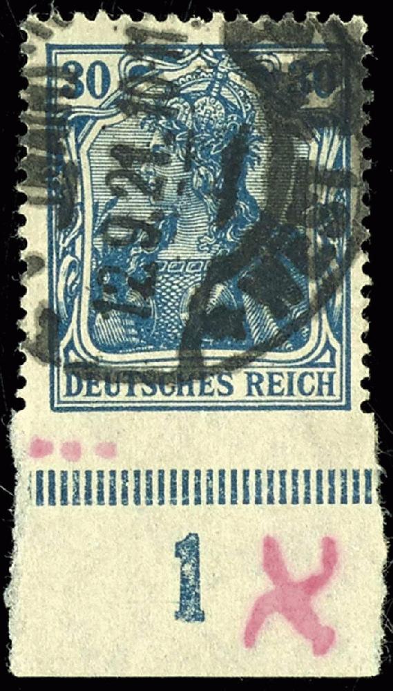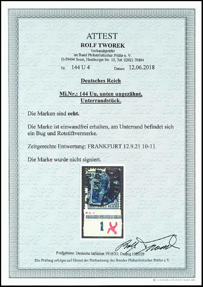 | Zusatzinformationen und Suchstichworte: | Dr. Reinhard Fischer 193. Auktion 21. - 22. Juli 2023 Los 1697 Deutsches Reich, Germania mit WZ 30 Pfennig Germania als unten ungezähntes Exemplar mit breitem Unterrand, dort waagerechte Faltung und Rotstiftvermerk, zeitgerecht entwertet "Frankfurt (Main) / West / 12.9.21", im Übrigen tadellose Erhaltung, sehr seltene Abart, Fotoattest Tworek BPP (2018) Ausruf 1.800,00 EUR |