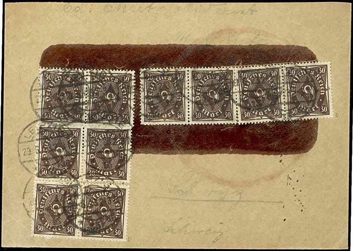 | Zusatzinformationen und Suchstichworte: | Dr. Reinhard Fischer 193. Auktion 21. - 22. Juli 2023 Los 1747 Deutsches Reich, 1918/23 Inflationsausgaben 30 Mark Posthorn schwärzlichbraun, 5 waagerechte Paare als seltene portorichtige Mehrfachfrankatur auf Auslandsbrief von LEIPZIG 29.6.23 nach Schwyz (Ank.stpl), Fotoattest Winkler BPP: "echt, 2. Paar von links Eckzahnfehler, sonst alle Paare sehr gut gezähnt, Brief oben beschnitten und leichte Beförderungsspuren, insgesamt gute Erhaltung", Mi. 1.000.-+ Ausruf 200,00 EUR |