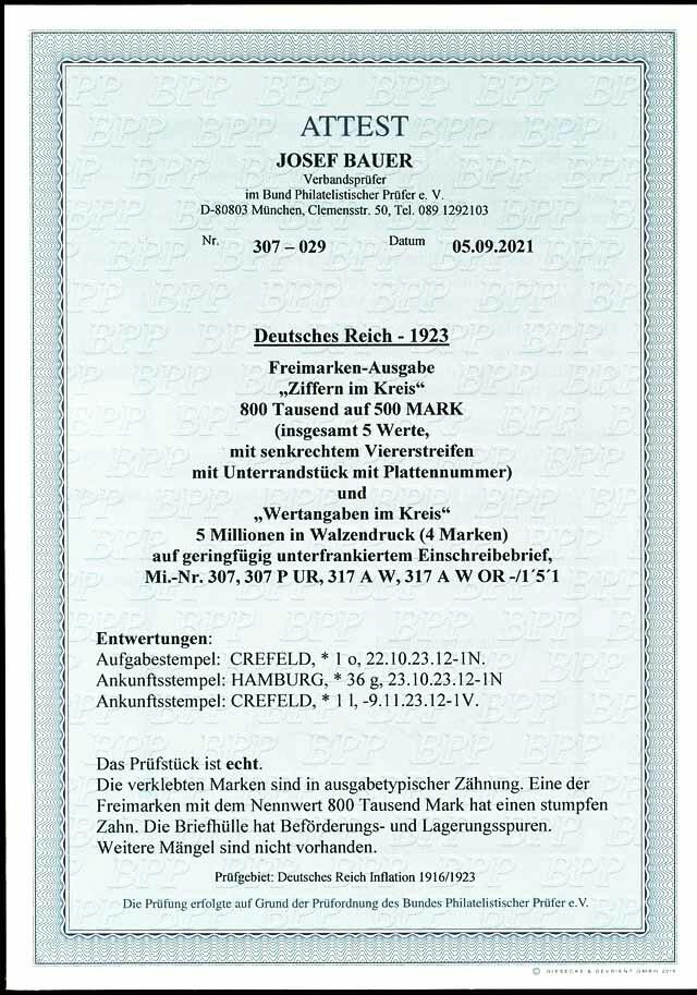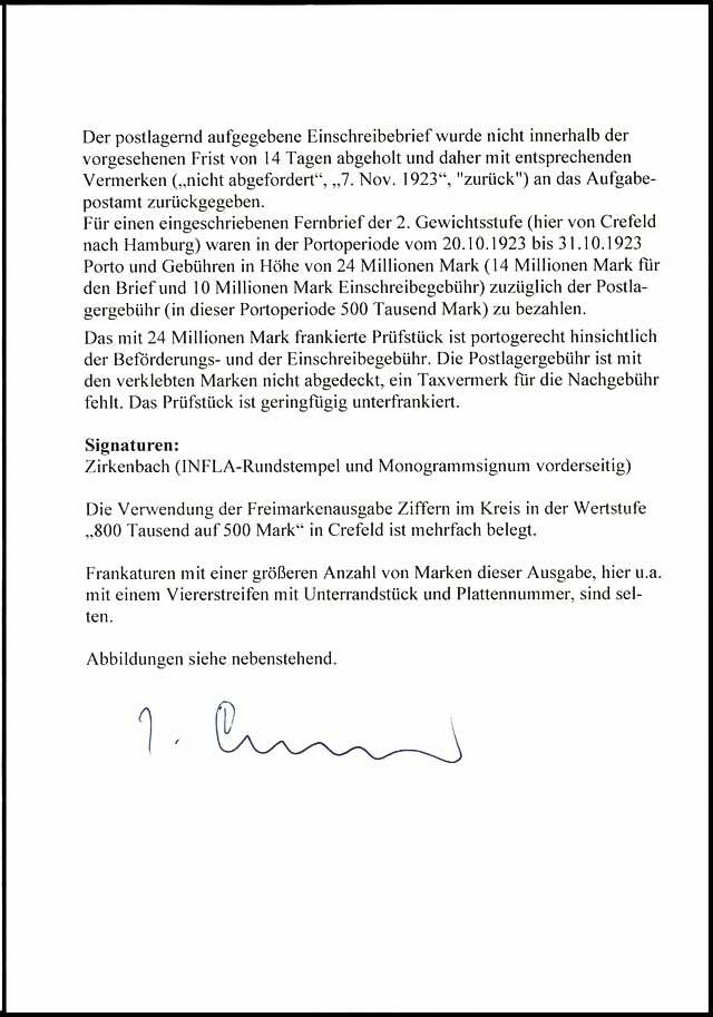 | Zusatzinformationen und Suchstichworte: | Dr. Reinhard Fischer 193. Auktion 21. - 22. Juli 2023 Los 1774 Deutsches Reich, 1918/23 Inflationsausgaben 800 Tausend auf 500 Mark Ziffer gelblichgrün, diese schon einzeln gestempelt sehr seltene Infla-Ausgabe hier im Viererstreifen mit Unterrand und Plattennummer (!), außerdem ein weiteres Exemplar einzeln mit Zusatzfrankatur Rosettenmuster, viermal 5 Millionen in zwei senkrechten Paaren auf Einschreibebrief aus Krefeld nach Hamburg. Jede Marke entwertet "Crefeld / 22.10.23". Dieser war laut Fotoattest Bauer BPP (2021) geringfügig unterfrankiert, da der Brief "postlagernd" adressiert war, aber hierfür die Gebühr nicht verklebt worden war. Nicht abgeholt, ging der Brief dann nach der Frist von 14 Tagen zurück an den Absender. Entsprechende Stempel "Nicht abgefordert / Hamburg 36, Ausgabe" und "zurück" sowie rs. AK "Crefeld / 9.11.23". Vorderseitig außerdem Prüfzeichen "Z" (Zirkenbach) / INFLA BERLIN. Nach Attest sind bis auf einen stumpfen Zahn bei einer 800 Tausend-Marke und Beförderungs- bzw. Lagerungsspuren weitere Mängel nicht vorhanden - wir fügen hinzu: ein echtes Schaustück für jede große Sammlung, sehr attraktiv und sicher ausgesprochen selten Ausruf 3.500,00 EUR |