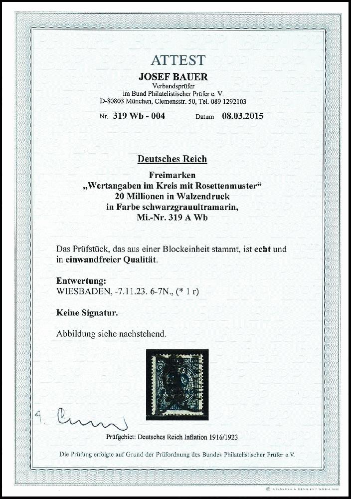 | Prüfgebiet: | Deutsches Reich 1919 - 1923 (Mi-Nr. 107 - 343) |