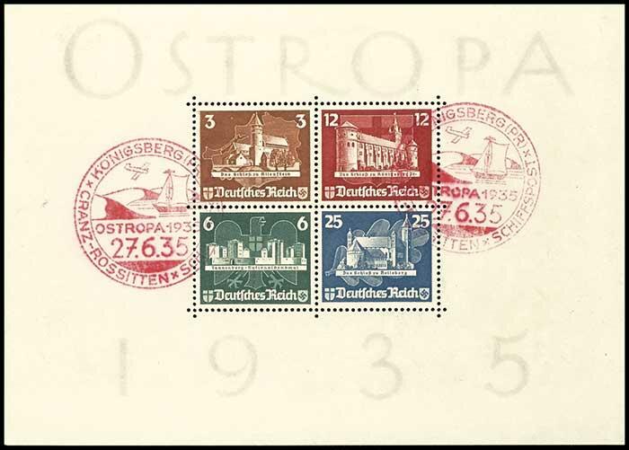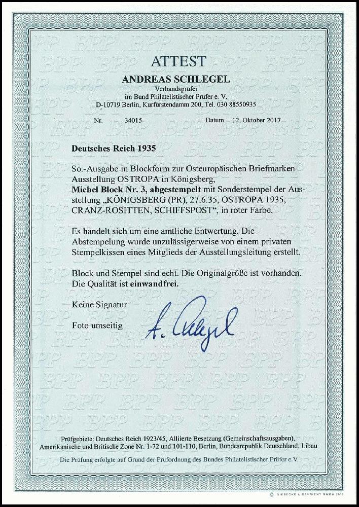 | Zusatzinformationen und Suchstichworte: | Dr. Reinhard Fischer 193. Auktion 21. - 22. Juli 2023 Los 1952 Deutsches Reich, 1933/45 Drittes Reich Blockausgabe "Osteuropäische Briefmarkenausstellung OSTROPA in Königsberg" in voller Originalgröße, frisches helles Papier mit zwei sauber aufsitzenden Sonderstempeln "KÖNIGSBERG 27.6.35" in extrem seltener roter Stempelfarbe, Abschläge in roter Stempelfarbe stammen vom einem privaten Stempelkissen eines Mitgliedes der Ausstellungsleitung, Fotoattest A. Schlegel BPP "... Stempel echt. Die Qualität ist einwandfrei" Ausruf 1.000,00 EUR |