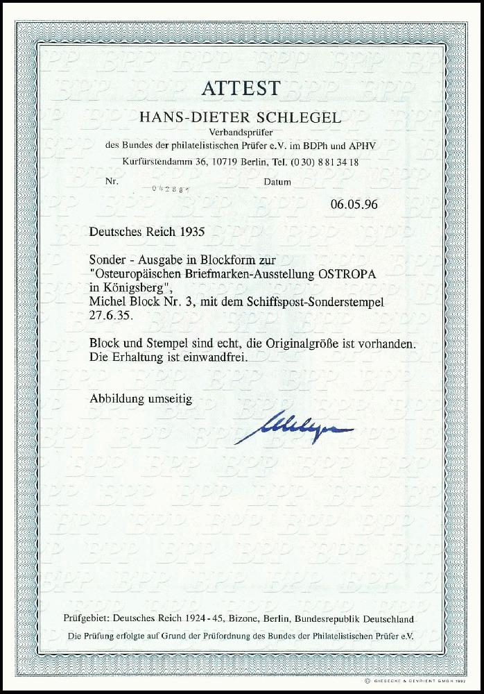 | Zusatzinformationen und Suchstichworte: | Dr. Reinhard Fischer 193. Auktion 21. - 22. Juli 2023 Los 1953 Deutsches Reich, 1933/45 Drittes Reich Blockausgabe "Osteuropäische Briefmarkenausstellung OSTROPA in Königsberg", besserer Sonderstpl "CRANZ-ROSSITTEN", Fotoattest Schlegel BPP: "echt und einwandfrei", Mi. 1.100,-+ Ausruf 250,00 EUR |