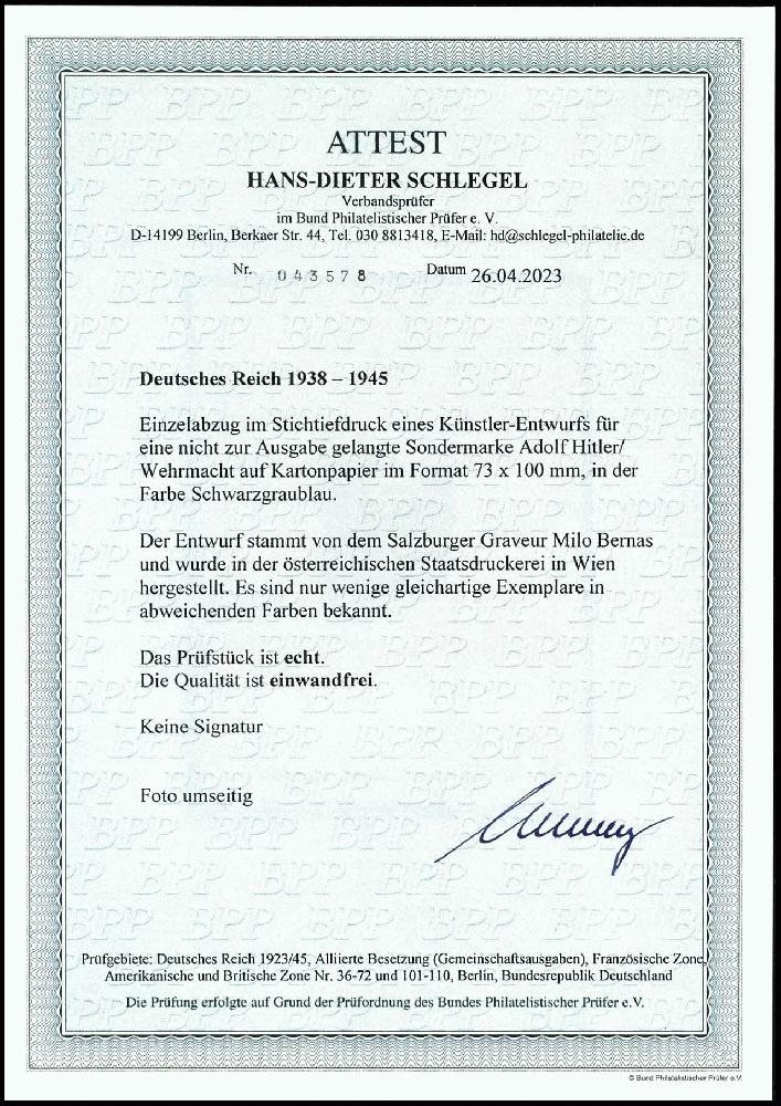 | Zusatzinformationen und Suchstichworte: | Dr. Reinhard Fischer 193. Auktion 21. - 22. Juli 2023 Los 2036 Deutsches Reich Einzelabzug im Stichtiefdruck eines Künstler-Entwurfs für eine nicht zur Ausgabe gelangte Sondermarke Adolf Hitler/Wehrmacht, Kartonpapier, Format 73 x 100 mm, Farbe schwarzgraublau. Der Entwurf stammt von dem Salzburger Graveur Milo Bernas und wurde in der österreichischen Staatsdruckerei in Wien hergestellt. Es sind nur wenige gleichartige Exemplare in abweichenden Farben bekannt. Unsigniert, Fotoattest H.-D. Schlegel BPP (2023): "Die Qualität ist einwandfrei." Ausruf 1.500,00 EUR |