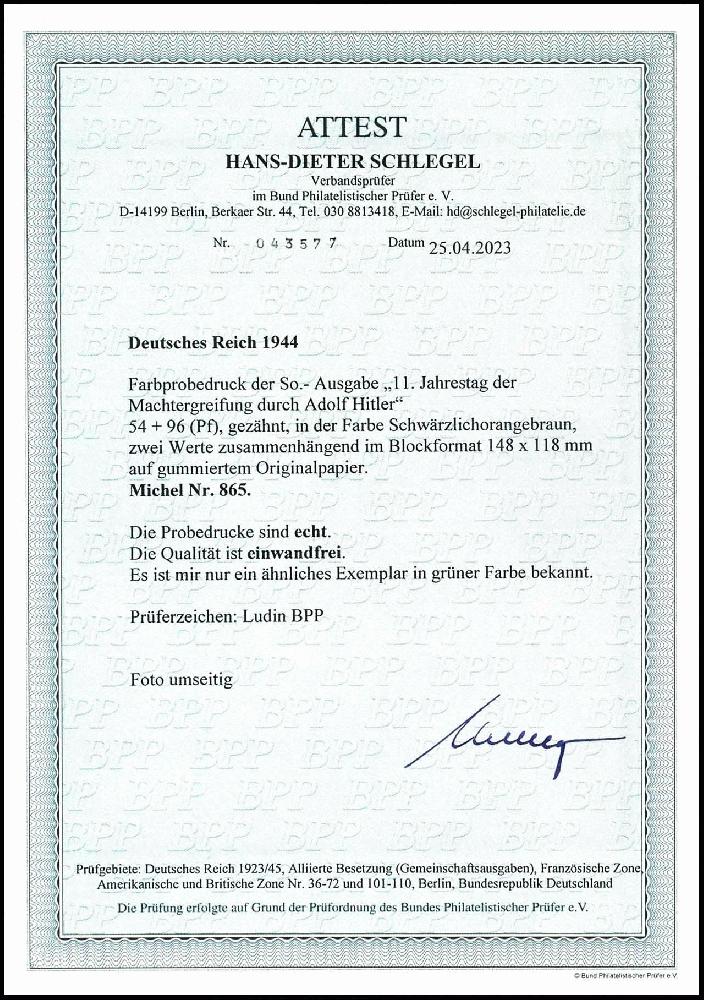 | Zusatzinformationen und Suchstichworte: | Dr. Reinhard Fischer 193. Auktion 21. - 22. Juli 2023 Los 2041 Deutsches Reich, 1933/45 Drittes Reich 54 + 96 Pfennig "11. Jahrestag der Machtergreifung durch Adolf Hitler", Farbprobedruck in schwärzlichorangebraun, gezähnt, zwei Werte zusammenhängend im Blockformat 148 x 118 mm auf gummiertem Originalpapier, geprüft Ludin BPP und Fotoattest H.-D. Schlegel BPP (2023): "Die Qualität ist einwandfrei. Es ist mir nur ein ähnliches Exemplar in grüner Farbe bekannt." Ausruf 2.500,00 EUR |