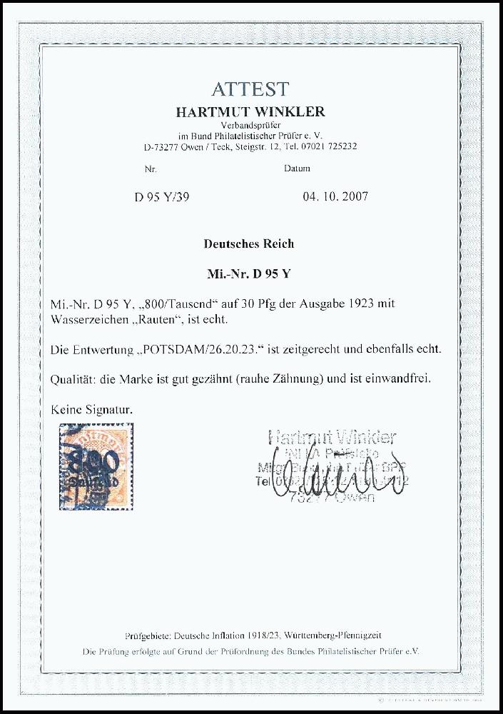 | Zusatzinformationen und Suchstichworte: | Dr. Reinhard Fischer 193. Auktion 21. - 22. Juli 2023 Los 2096 Deutsches Reich 800 Tsd auf 30 Pfg, Wasserzeichen Rauten, gestempelt, tadellose Erhaltung, Fotoattest Winkler BPP, Mi. 400.- Ausruf 100,00 EUR |