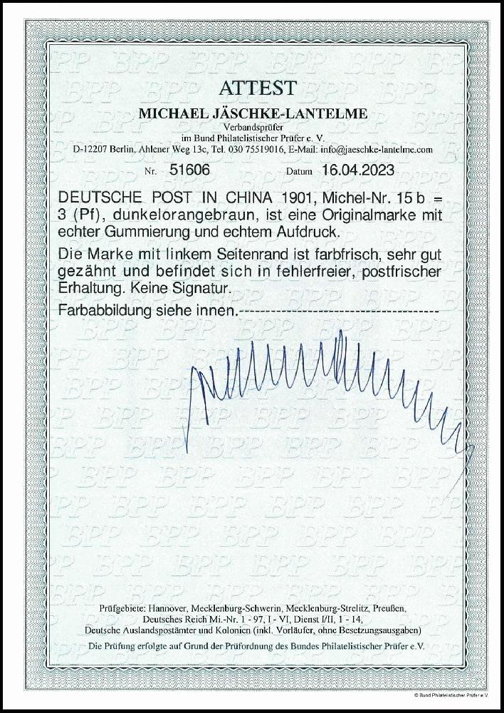 | Zusatzinformationen und Suchstichworte: | Dr. Reinhard Fischer 193. Auktion 21. - 22. Juli 2023 Los 2464 Deutsche Auslandspost China 3 Pfg Germania Reichspost mit Aufdruck "China", dunkelorangebraun, tadellos postfrisch und noch unsigniert, Fotoattest Michael Jäschke-Lantelme BPP (2023): "in fehlerfreier, postfrischer Erhaltung.", Mi. 480.- Ausruf 160,00 EUR |