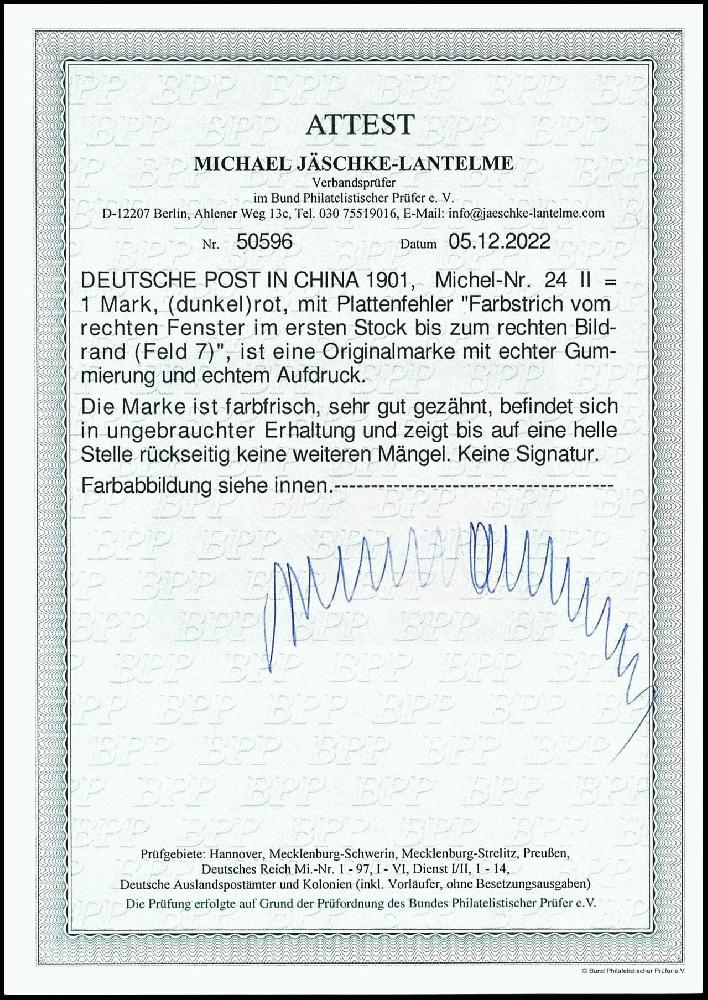 | Zusatzinformationen und Suchstichworte: | Dr. Reinhard Fischer 193. Auktion 21. - 22. Juli 2023 Los 2472 Deutsche Auslandspost China 1 Mark Reichspost mit Aufdruck "China", Plattenfehler II "Farbstrich vom rechten Fenster im ersten Stock bis zum rechten Bildrand" - Feld 7, ungebraucht, abgesehen von einer hellen Stelle rückseitig in fehlerfreier Erhaltung, sehr selten, Fotoattest Michael Jäschke-Lantelme BPP (2023), Mi. -.- Ausruf 450,00 EUR |