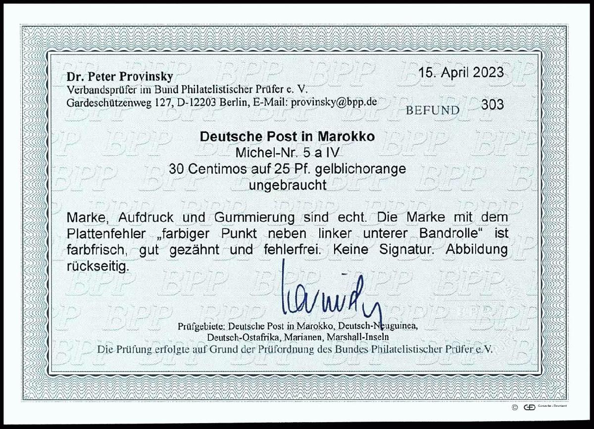 | Zusatzinformationen und Suchstichworte: | Dr. Reinhard Fischer 193. Auktion 21. - 22. Juli 2023 Los 2572 Deutsche Auslandspost Marokko 30 C. auf 25 C. Krone/Adler mit Plattenfehler IV "farbiger Punkt neben linker unterer Bandrolle", tadellos ungebraucht mit Originalgummierung, Fotobefund Dr. Peter Provinsky BPP: "echt und fehlerfrei", Mi. 300.- Ausruf 90,00 EUR |