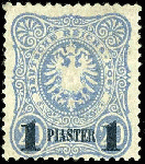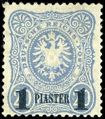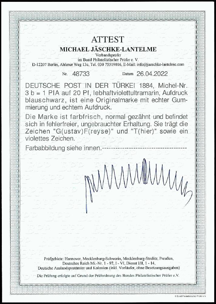 | Zusatzinformationen und Suchstichworte: | Dr. Reinhard Fischer 193. Auktion 21. - 22. Juli 2023 Los 2691 Deutsche Auslandspost Türkei 1 Piaster auf 20 Pfennig lebhaftviolettultramarin mit blauschwarzem Aufdruck, tadellos ungebraucht mit Originalgummierung, geprüft Freyse, Thier, Fotoattest Jäschke-Lantelme: "in fehlerfreier, ungebrauchter Erhaltung.", Mi. 3.000.- Ausruf 1.000,00 EUR |