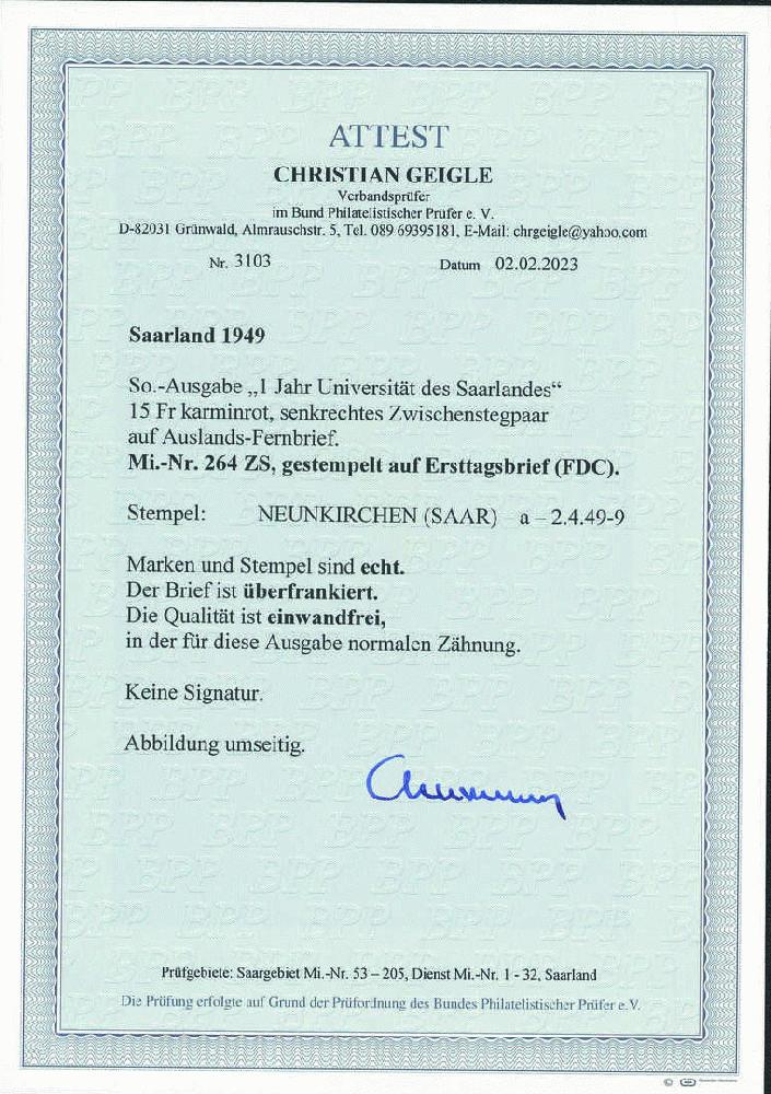| Prüfgebiet: | Saarland (ab Mi-Nr. 206) |