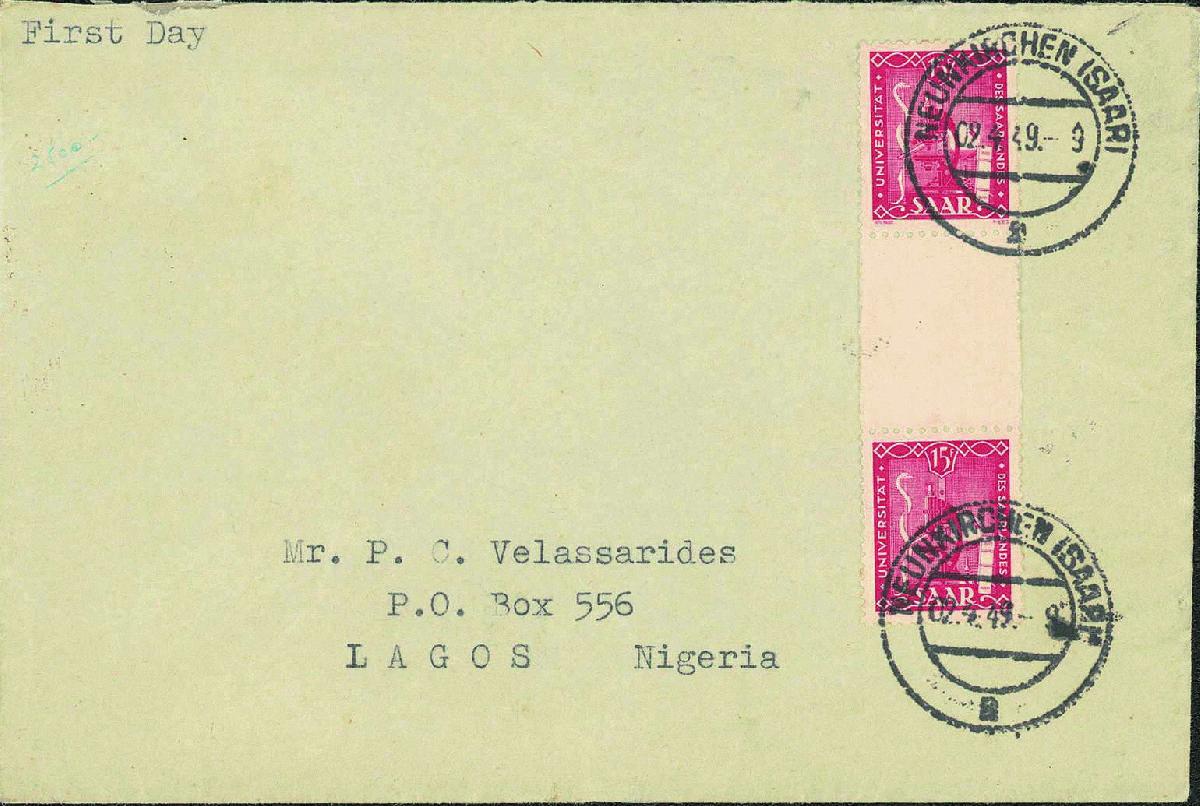 | Zusatzinformationen und Suchstichworte: | Gert Müller 119. Auktion 24. - 26. August 2023 Los 2693 Saar DER ZWISCHENSTEG-ERSTTAGSBRIEF NACH NIGERIA: 15 Fr. Universität 1949, senkrechtes Zwischenstegpaar, farbfrisch und tadellos auf sensationellem Ersttagsbrief mit zwei klaren Ersttagsstempeln "NEUNKIRCHEN 2.4.49." nach Lagos/Nigeria. Ersttagsbriefe dieser Ausgabe sind generell sehr selten, da der entsprechende Sonderstempel erst am 2. Ausgabetag verwendet wurde. Bei dem hier angebotenen Beleg handelt es sich um das einzig bekannte Zwischenstegpaar auf Ersttagsbrief und somit eine der großen Neusaar-Raritäten! Fotoatteste "DIE QUALITÄT IST EINWANDFREI" Ney BPP und Geigle BPP Ausruf 2.000,00 EUR |