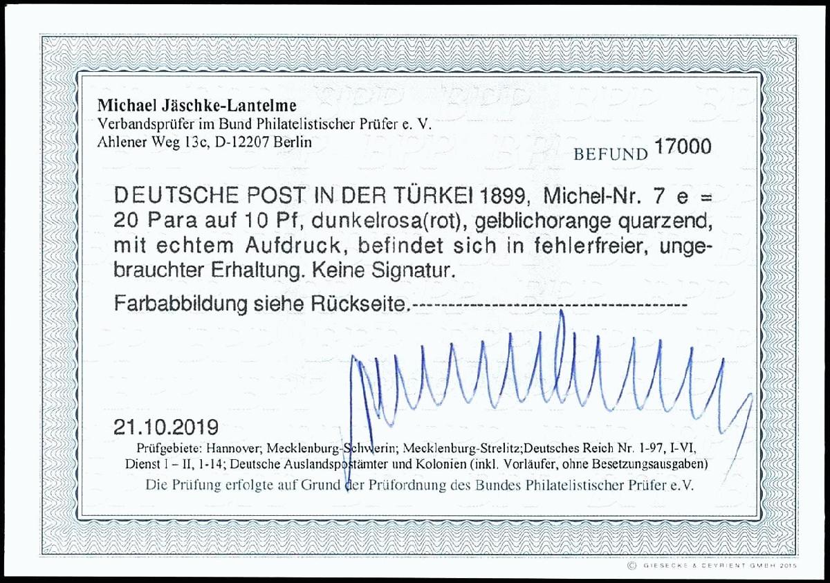 | Zusatzinformationen und Suchstichworte: | Dr. Reinhard Fischer 193. Auktion 21. - 22. Juli 2023 Los 2700 Deutsche Auslandspost Türkei 20 Para a. 10 Pfg dunkelrosa(rot), UV gelblichorange, farbfrisches Kabinettstück, ungebraucht mit Originalgummierung und Falzrest, Fotobefund Jäschke-L. BPP (10/2019) "...in fehlerfreier Erhaltung." Ausruf 70,00 EUR |