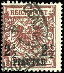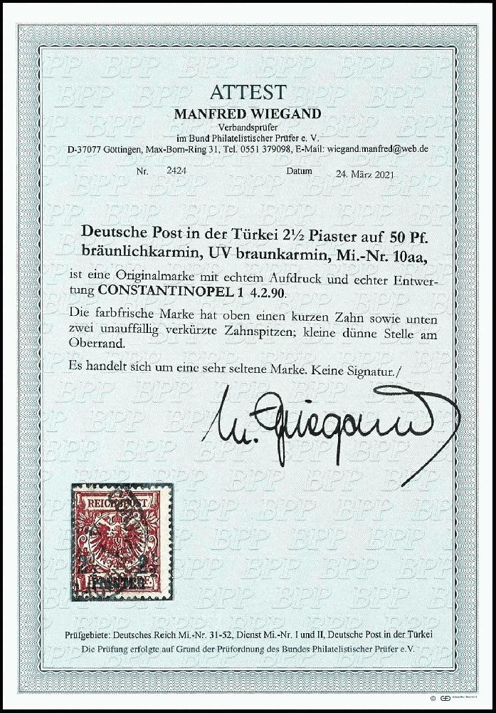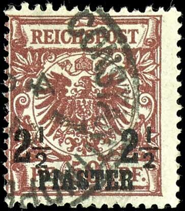 | Zusatzinformationen und Suchstichworte: | Dr. Reinhard Fischer 193. Auktion 21. - 22. Juli 2023 Los 2715 Deutsche Auslandspost Türkei 2 1/2 Piaster auf 50 Pfennig Krone/Adler bräunlichkarmin (UV braunkarmin), entwertet "Constantinopel 1 4.2.90", oben kurzer Zahn sowie unten zwei unauffällig verkürzte Zahnspitzen; kleine dünne Stelle am Oberrand, Fotoattest Manfred Wiegand BPP: "Es handelt sich um eine sehr seltene Marke.", Mi. 4.000.- Ausruf 500,00 EUR |