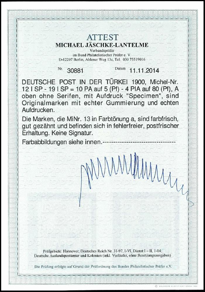 | Zusatzinformationen und Suchstichworte: | Dr. Reinhard Fischer 193. Auktion 21. - 22. Juli 2023 Los 2722 Deutsche Auslandspost Türkei 10 Para auf 5 Pfennig bis 4 Piaster auf 80 Pfennig Germania mit Aufdruck "Specimen", postfrisch in unsignierter Luxusqualität, Fotoattest Jäschke-Lantelme BPP: "in fehlerfreier, postfrischer Erhaltung.", Mi. 2.800.- Ausruf 800,00 EUR |