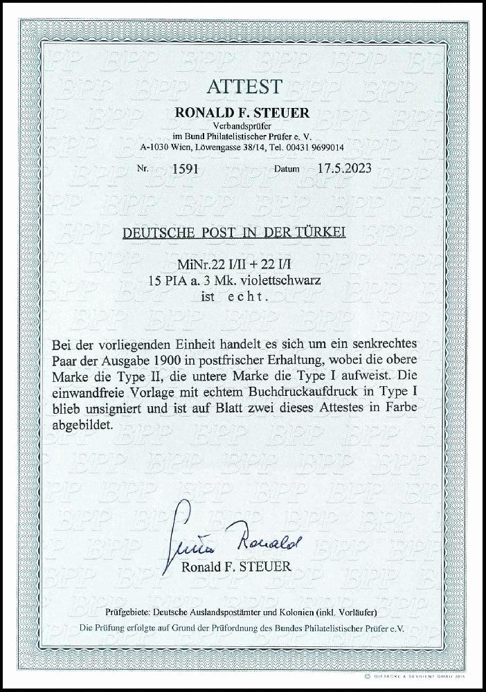 | Zusatzinformationen und Suchstichworte: | Dr. Reinhard Fischer 193. Auktion 21. - 22. Juli 2023 Los 2744 Deutsche Auslandspost Türkei 15 Piaster auf 3 Mark Deutsches Reich mit Inschrift "Reichspost", Aufdruck in Type I, senkrechtes Typenpaar mit den Urmarken Typen I (untere Marke) und II (obere Marke), tadellos postfrisch, unsigniertes Luxusstück, Fotoattest R. F. Steuer BPP (2023): "einwandfreie Vorlage.", Mi. 700.- Ausruf 250,00 EUR |