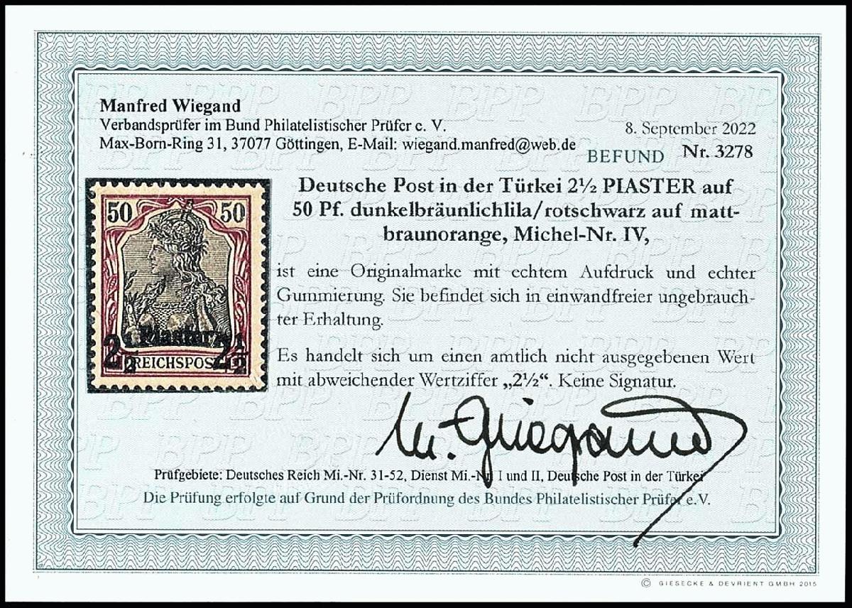 | Zusatzinformationen und Suchstichworte: | Dr. Reinhard Fischer 193. Auktion 21. - 22. Juli 2023 Los 2754 Deutsche Auslandspost Türkei Amtlich nicht ausgegeben: 2 1/2 Piaster auf 50 Pfennig Germania, tadellos ungebraucht, Fotobefund Wiegand BPP: "in einwandfreier ungebrauchter Erhaltung.", Mi.400.- Ausruf 100,00 EUR |