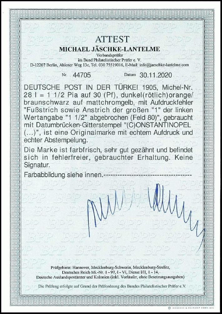 | Zusatzinformationen und Suchstichworte: | Dr. Reinhard Fischer 193. Auktion 21. - 22. Juli 2023 Los 2761 Deutsche Auslandspost Türkei 1 1/2 Pia auf 30 Pfg Germania mit Aufdruckfehler "Fußstrich sowie Anstrich der großen '1' der linken Wertangabe '1 1/2' abgebrochen", gestempelt "Constantinopel", tadellose Erhaltung ,Fotoattest Jäschke-Lantelme BPP: "in fehlerfreier, gebrauchter Erhaltung.", Mi. 900.- Ausruf 180,00 EUR |