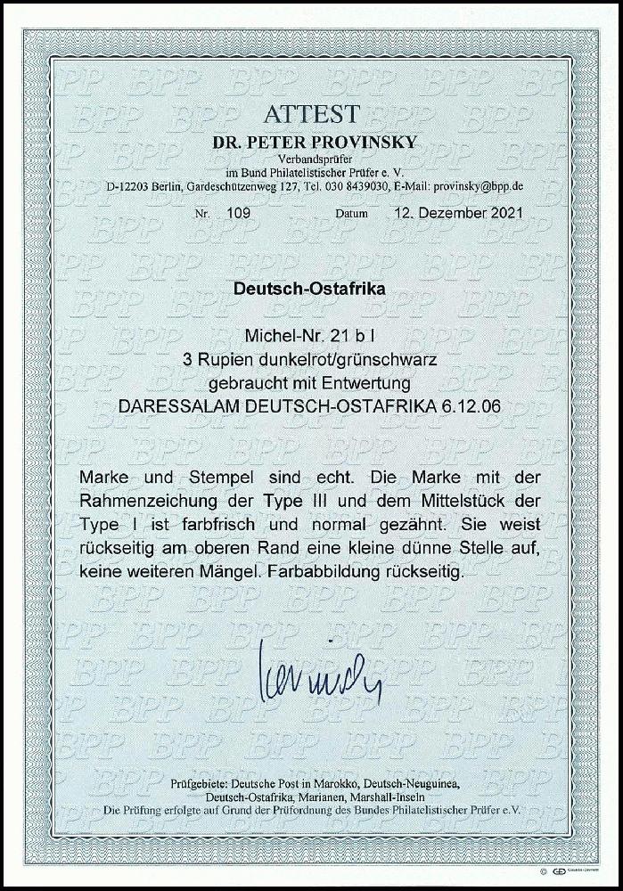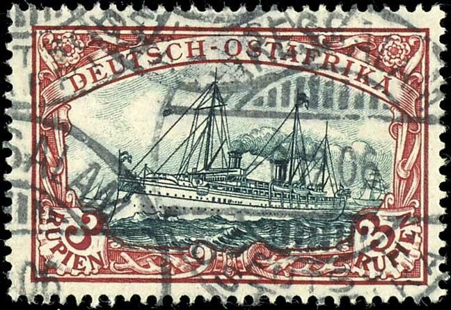 | Zusatzinformationen und Suchstichworte: | Dr. Reinhard Fischer 193. Auktion 21. - 22. Juli 2023 Los 2976 Deutsche Kolonien Ostafrika 3 Rupien Kaiseryacht, dunkelrot/grünschwarz, Rahmenzeichnung Type III und Mittelstück Type I, gestempelt "Daressalam Deutsch-Ostafrika 6.12.06", abgesehen von einer kleinen dünnen Stelle ab oberen Markenrand in tadelloser Erhaltung, Fotoattest Dr. Provinsky BPP, Mi. 1.500.- Ausruf 150,00 EUR |