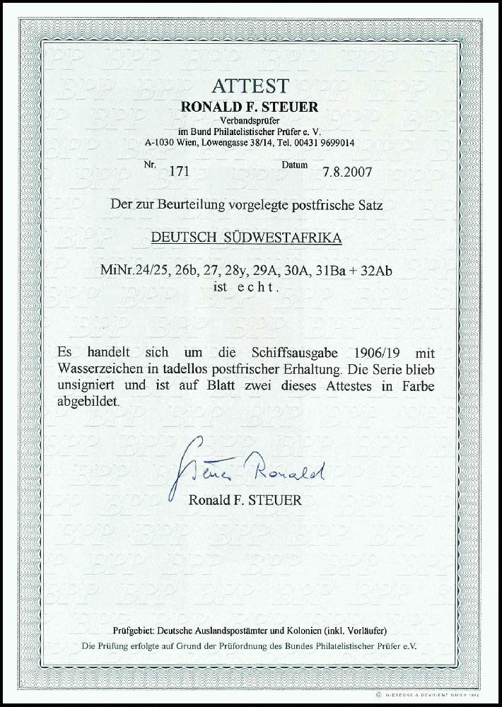 | Zusatzinformationen und Suchstichworte: | Dr. Reinhard Fischer 193. Auktion 21. - 22. Juli 2023 Los 3233 Deutsche Kolonien Südwestafrika 3 Pfennig bis 5 Mark Kaiseryacht, neun Werte, tadellos postfrisch, unsigniert, Fotoattest Steuer BPP: "in tadellos postfrischer Erhaltung.", Mi. 370.- Ausruf 150,00 EUR |
